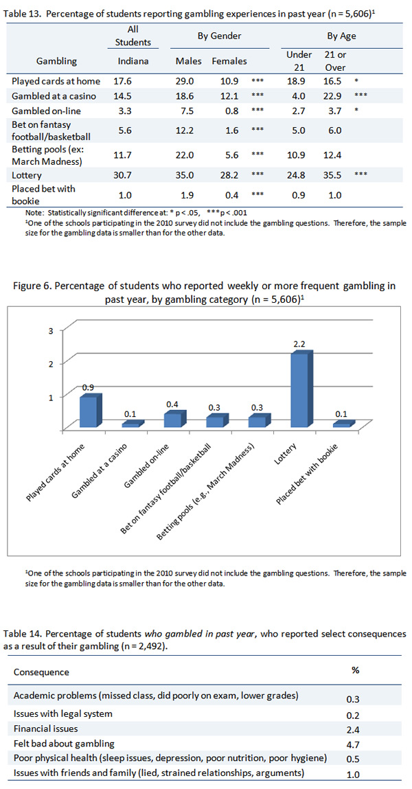 A recent national survey of 18‐21 year olds (Barnes et al., 2010) found that 75% of the college students reported gambling in the past year, which was similar to the rate reported by the noncollege young adults surveyed. The rate of frequent gambling (weekly or more) was lower for U.S. college students (18%) than their non‐college peers (25%). Male college students reported significantly higher prevalence rates of gambling (83% vs. 67%) and frequent gambling (31% vs. 6%) than the female students. The most common form of gambling reported by Indiana students participating in the 2010 Indiana College Substance Use Survey was playing the lottery (31%), followed by playing cards at home (18%). Male Indiana students reported higher rates of gambling than female students for all gambling behaviors investigated. Over one‐third of the male students (35%) played the lottery in the past year, compared to just over one‐quarter (28%) of the female students. Almost three in ten male students (29%) played cards at home for money, compared to one in nine (11%) of the female students. Over one‐fifth of the male students (22%) gambled in betting pools and almost as many (19%) gambled at a casino. Students 21 or older reported significantly higher rates of gambling at a casino (23%), playing the lottery (36%), and gambling on‐line than the younger students. However, students under 21 reported higher rates of playing cards at home for money (19% vs. 17%) (Table 13). Students were asked how frequently they gambled to assess the level of excessive gambling. Two percent of the students played the lottery at least once a week in the past year and one percent reported playing cards at home for money at least weekly (Figure 6). The most common negative consequence of gambling reported by Indiana students was feeling bad about their gambling (5%), followed by financial issues (2%) (Table 14).